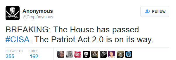 La Cámara de Representantes y el Senado de EE.UU. han aprobado un presupuesto de 1,15 billones de dólares, y con él, un polémico proyecto de ley de seguridad cibernética que ha generado reacciones en contra por violar la privacidad del usuario. La controvertida legislación va destinada a alentar a las empresas a compartir datos privados de los usuarios con el Gobierno, y permite al Gobierno «utilizar esa información para cualquier propósito, sin apenas protección de la privacidad», informa el portal The Intercept.