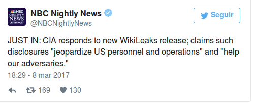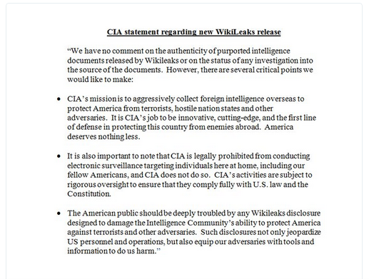 Por su parte, la CIA también ha emitido un comunicado defendiéndose de toda la polémica levantada por las revelaciones de Wikileaks. Dicen no tener comentarios que hacer sobre los documentos filtrados o si están llevando a cabo una investigación sobre cómo se filtraron, pero recuerdan que su misión es la de «obtener inteligencia de otros países para proteger a los Estados Unidos de terroristas, naciones hostiles y otros adversarios».