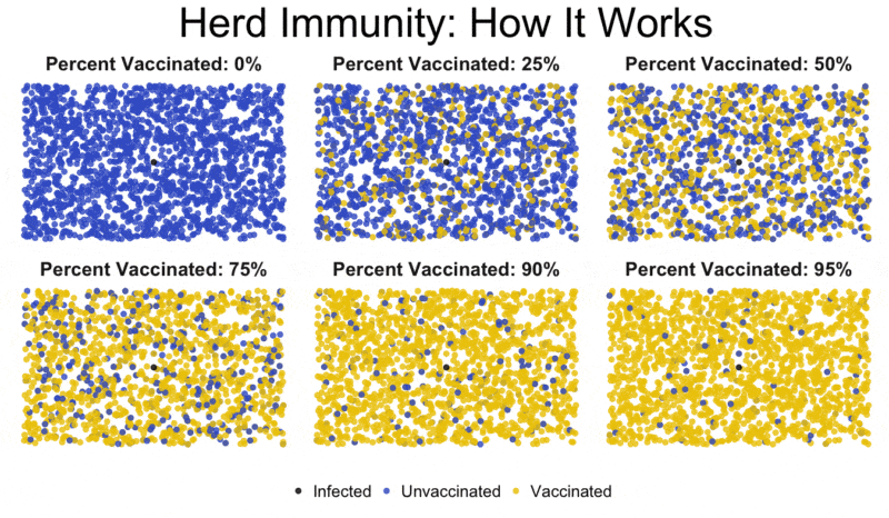 El problema de este concepto es que, para que la inmunidad de rebaño sea efectiva, la proporción de individuos vacunados debe ser altísima, casi total. Sobre estás líneas tenéis un GIF que ilustra a la perfección cómo funciona la inmunidad de grupo. Los puntos amarillos son los niños vacunados. Los puntos azules son niños sin vacunar, y las líneas rojas son los vectores de transmisión de la enfermedad.