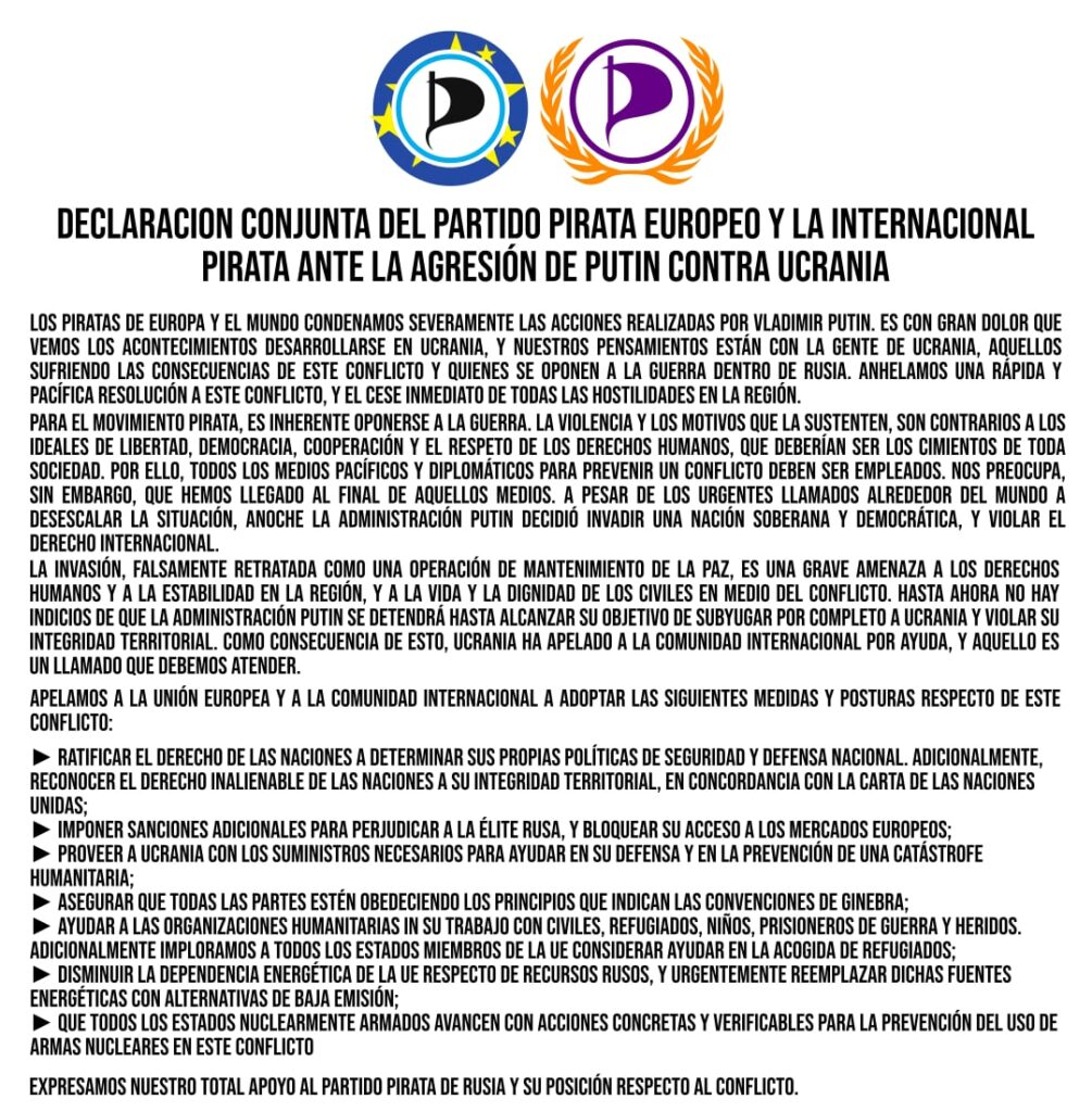 Los Piratas de Europa y el mundo condenamos severamente las acciones realizadas por Vladimir Putin. es con gran dolor que vemos los acontecimientos desarrollarse en Ucrania, y nuestros pensamientos están con la gente de Ucrania, aquellos sufriendo las consecuencias de este conflicto y quienes se oponen a la guerra dentro de Rusia. Anhelamos una rápida y pacífica resolución a este conflicto, y el cese inmediato de todas las hostilidades en la región.