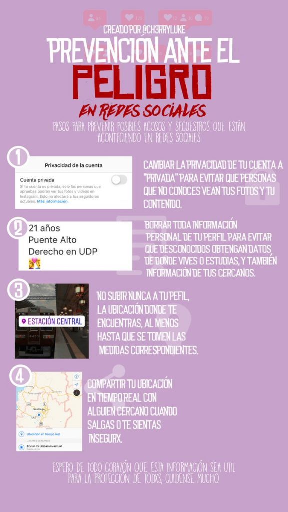 El origen de este fenómeno es sin dudas el contexto patriarcal en el que vivimos. Pero también este caso es un llamado de alerta para cuidar los datos personales que se difunden a través de las redes sociales. Lugares de residencia, estudio o trabajo son fácilmente rastreables a través de facebook o instagram, los cuales al estar en modo “público”, permiten conseguir información personal, lugares o rutas comunes que frecuentan las personas, además de acceder a los contactos más cercanos.