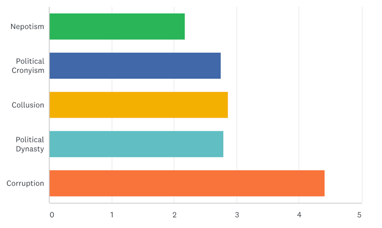La investigación encuentra que la mayoría de los participantes están de acuerdo en que la corrupción es mala. Estos encuestados también califican la corrupción, incluyendo el soborno, la malversación de fondos, el abuso de autoridad y el lavado de dinero, como algo peor que las dinastías políticas, la colusión y el amiguismo político, y el nepotismo.