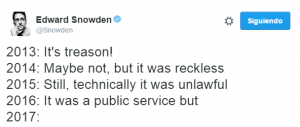 Pero aunque poco a poco parece que los grandes perseguidores de Snowden empiezan a cambiar su discurso, los políticos durante la larga campaña electoral Estadounidense no rebajan el tono. Donald Trump por ejemplo dijo en 2013, que Snowden era un traidor y un verdadero peligro, y que se debería hacer con él lo que hacía Estados Unidos con los traidores «en los buenos tiempos en los que éramos una nación fuerte», vamos, ejecutarle.