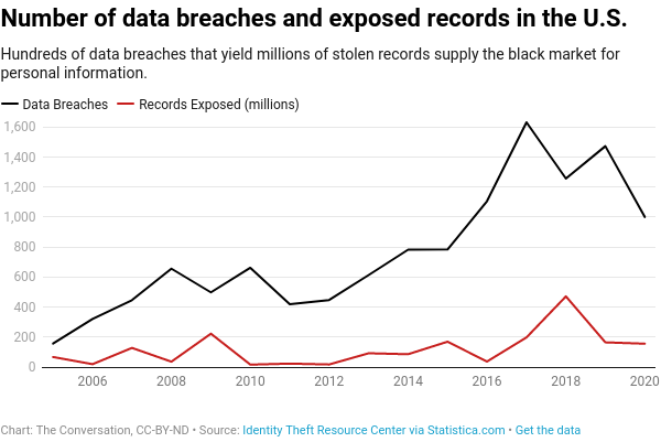 Aunque las violaciones de datos pueden ser una amenaza para la seguridad nacional, el 86% se trata de dinero y el 55% son cometidas por grupos delictivos organizados, según el informe anual de violaciones de datos de Verizon. Los datos robados a menudo terminan vendiéndose en línea en la web oscura. Por ejemplo, en 2018 los piratas informáticos ofrecieron a la venta más de 200 millones de registros que contenían información personal de personas chinas. Esto incluyó información sobre 130 millones de clientes de la cadena hotelera china Huazhu Hotels Group.