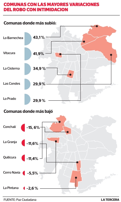 Por su parte, Paz Ciudadana reveló que el robo con intimidación aumentó principalmente en Lo Barnechea (ver infografía). En tanto, a nivel nacional, los delitos de alta connotación social bajaron un 2,9%.
