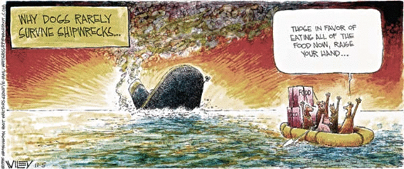 Otro problema a tener en cuenta es la psicología de la masa y los circuitos de retroalimentación descontrolados. La caricatura a continuación muestra a todos los perros en una balsa salvavidas levantando una pata para afirmar la orden de su líder de comerse toda la comida para perros rescatada de inmediato. ¡Mala decisión! Como muestran libros como Extraordinary Popular Delirions y Madness of Crowds, los seres humanos son bastante capaces de desarrollar delirios masivos, por lo que no es demasiado difícil imaginar una idea terrible ganando credibilidad y extendiéndose rápidamente a través del proceso de delegación de poderes. Imagínese lo que podría haber sucedido si en la semana posterior al 11 de septiembre de 2001 se votara una importante legislación que restringiera las libertades civiles.