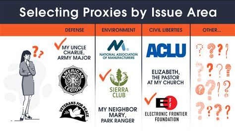 Si el votante en el gráfico a continuación le ha dado su poder (proxy) de «defensa» a su tío Charlie, un comandante del ejército, no necesitaría tomar una decisión por separado cada vez que surgiera un problema de defensa. Pero si no está contento con la forma en que el tío Charlie está votando en asuntos de defensa, puede retirar su poder en cualquier tema específico y votar por sí misma, o transferir su poder de “defensa” completo a un delegado diferente.