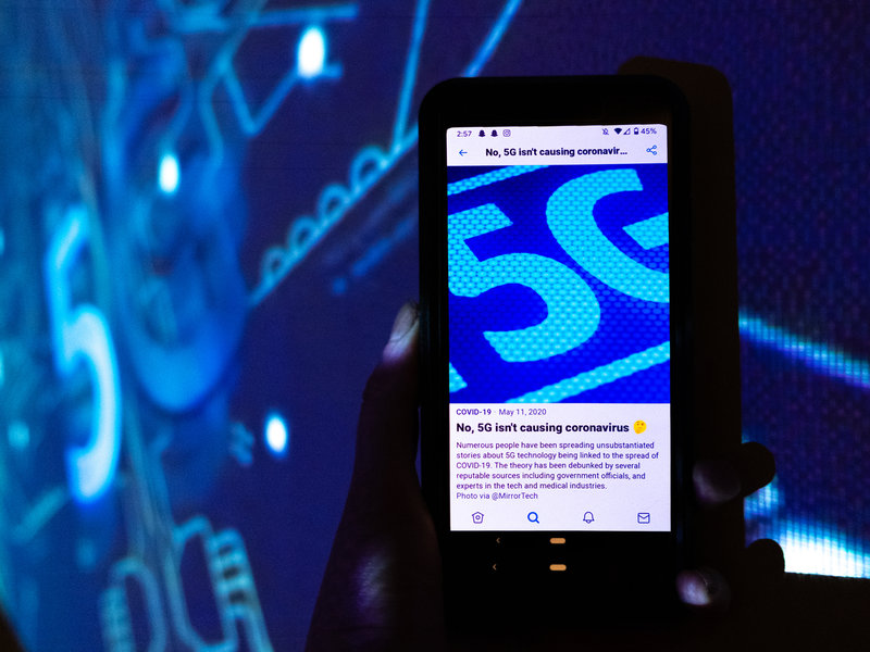 Y en la aplicación de Twitter, es posible que vea una advertencia debajo de las publicaciones con información COVID-19 falsa o engañosa. Un tweet de un usuario que proclama falsamente que la 5G causa el coronavirus, por ejemplo, tiene un gran signo de exclamación azul con un mensaje de Twitter: «Conozca los hechos sobre COVID-19». Se vincula a una historia que desacredita la afirmación de un medio de comunicación del Reino Unido llamado iNews.