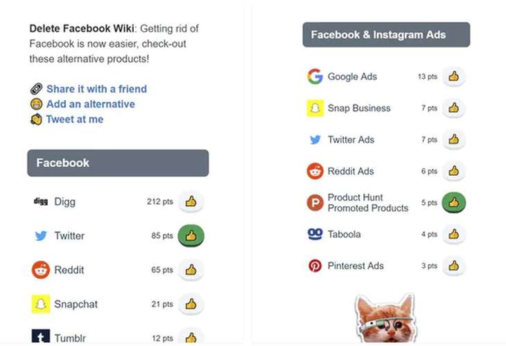 De manera más cercana en el tiempo, precisamente durante el pasado fin de semana, se ha dado a conocer un nuevo wiki en el que los usuarios pueden encontrar y votar por alternativas a los diferentes productos de Facebook.