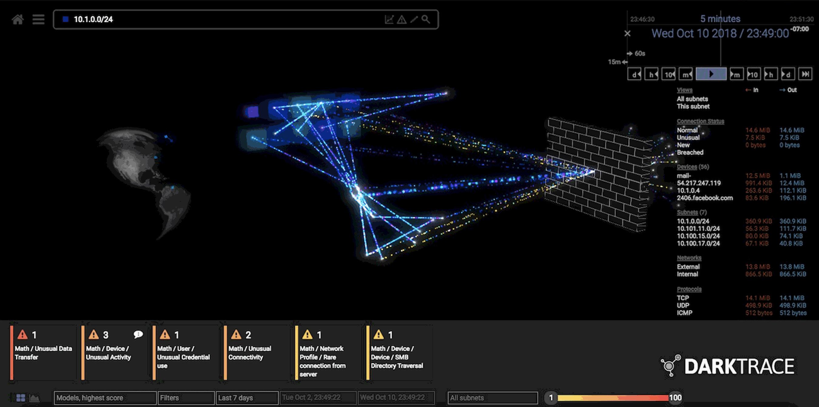 Cuando Darktrace implementa su software, configura sensores físicos y digitales alrededor de la red del cliente para trazar su actividad. Los datos sin procesar se canalizan a más de 60 diferentes algoritmos de aprendizaje no supervisado que compiten entre sí para encontrar un comportamiento anómalo.