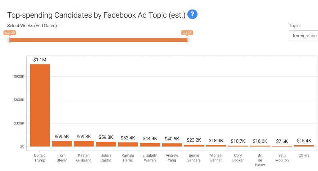 Constantes soflamas y tweets abiertamente racistas, mítines en los que sus vociferantes seguidores le piden que eche a determinadas políticas del país y sobre todo, una fortísima intensificación de la inversión en campañas de Facebook hablando de una invasión del país, de una supuesta emergencia nacional y de la necesidad de construir un muro para evitarlo están contribuyendo a un progresivo enrarecimiento del sentimiento de muchos ciudadanos con respecto a la inmigración. Entre marzo y julio de 2019, los supuestos problemas relacionados con la inmigración han sido la piedra de toque constante de las campañas de Trump en Facebook, como demuestra claramente (ver ilustración) una herramienta que hace seguimiento de las mismas y permite consultarlas por temática y candidato.