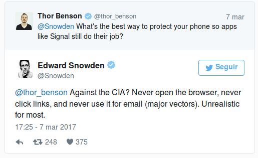 Estos ejemplos nos ayudan a entender el tipo de sacrificio que deberías hacer si quieres mantenerte al margen del espionaje de las agencias de inteligencia. Le preguntaban ayer a Snowden qué deberíamos hacer para poder utilizar nuestras apps de mensajería asegurándonos de que su cifrado sea útil, y la respuesta fue que nunca deberíamos abrir el navegador, hacer click en enlaces y nuca utilizar nuestro correo electrónico.