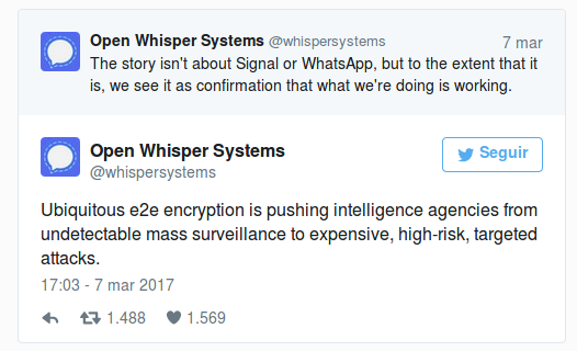 Puede parecer algo contradictorio pero pararos a pensar lo que han dicho desde Open Whisper Systems en Twitter sobre los cifrados de extremo a extremo. Estos métodos para asegurar nuestras comunicaciones se han vuelto tan efectivos que a las agencias de inteligencia tienen que bordearlos ya no atacando a la aplicación, sino al sistema operativo en el que se utiliza.