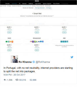 Ojo, no hagas caso a lo que dice @RoKhanna en su tuit sobre Portugal. El país sigue estando en la Unión Europea y ésta sostiene una norma que protege la neutralidad en la Red, con lo que este ejemplo de promoción de tarifas de MEO es eso, un ejemplo entre otras alternativas tradicionales. Los portugueses no están obligados a contratar esta oferta como tampoco los italianos que opten por esta otra oferta actual de Vodafone. Pero si triunfa el nuevo modelo este tipo de packs podrían no ser opcionales. Podrían ser la única alternativa.