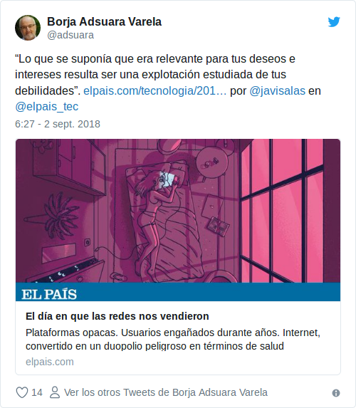 Eso nos llevaría a convertirnos en clientes de los servicios de empresas como Google, o bien en proveedores de los datos a cambio de otros servicios, como vender nuestra opinión a grupos de inversión para conocer el pulso del mercado. Esto no es ciencia ficción ni especulaciones. Es el modelo de negocio pilar actual de la economía de la red, y los expertos nos advierten de alguno de sus peligros.
